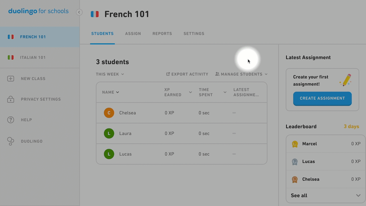 - Add your child or student to the classroom using their Duolingo account.